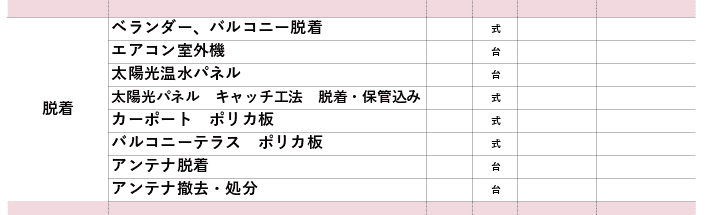 ここは欄は、脱着(又は撤去)が必要なものがある場合に記載します。