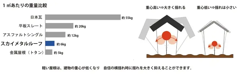 スカイメタルルーフは、1㎡あたり約6kg。軽量のため建物に負担をかけにくい屋根材です。