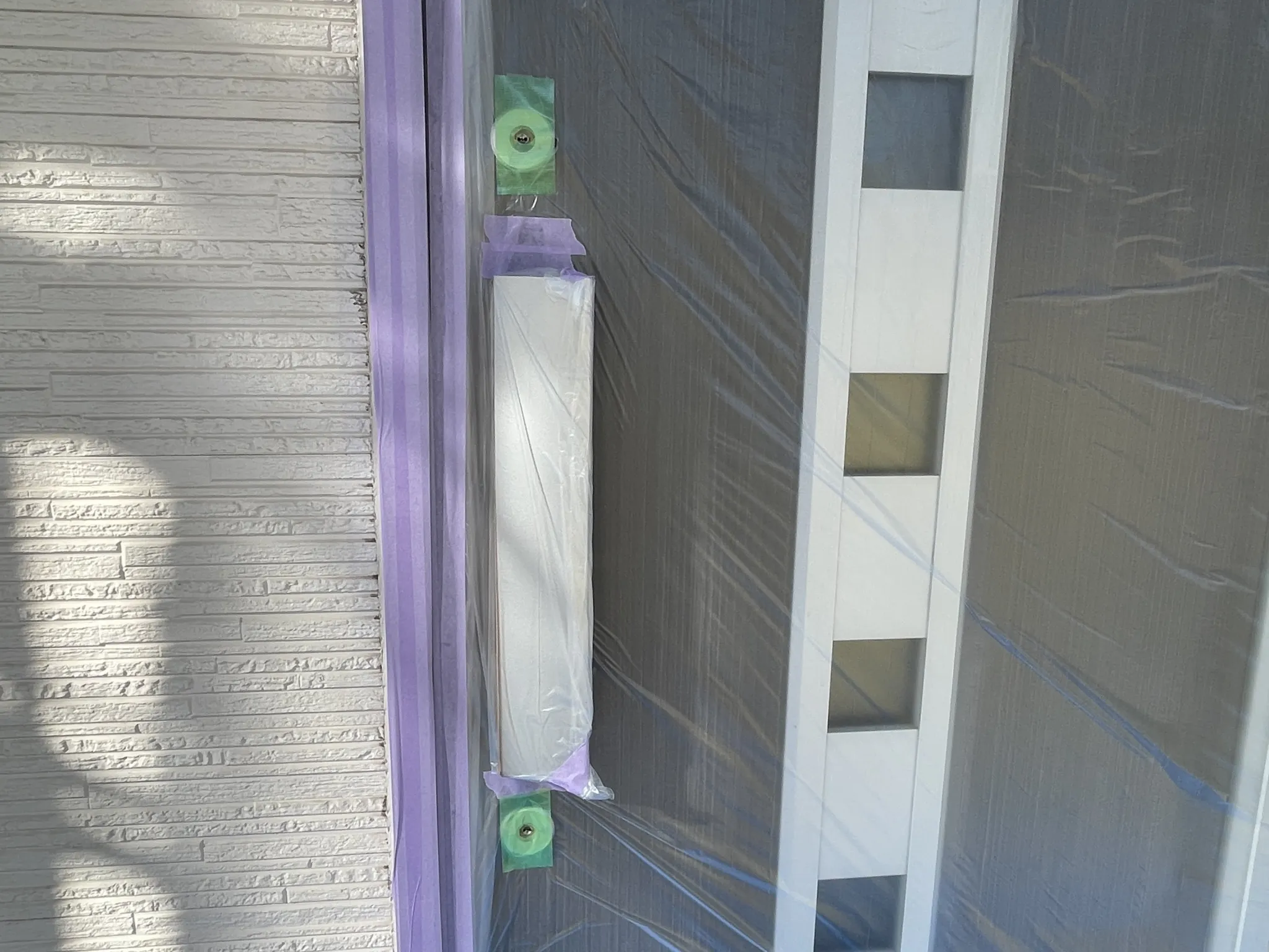 鍵穴も丁寧に養生します。真ん中に穴が開いているので、きちんと鍵を閉めることができます。