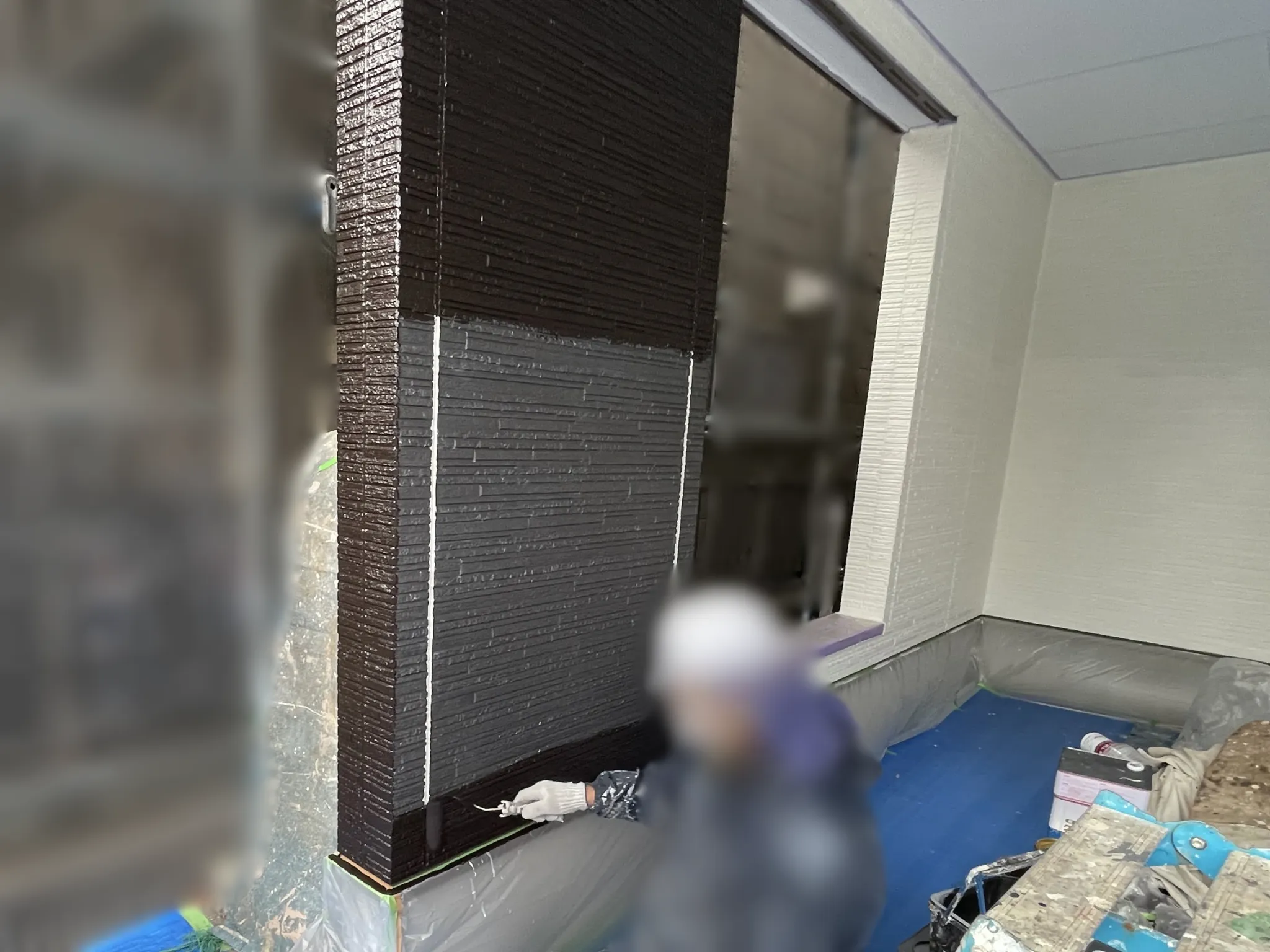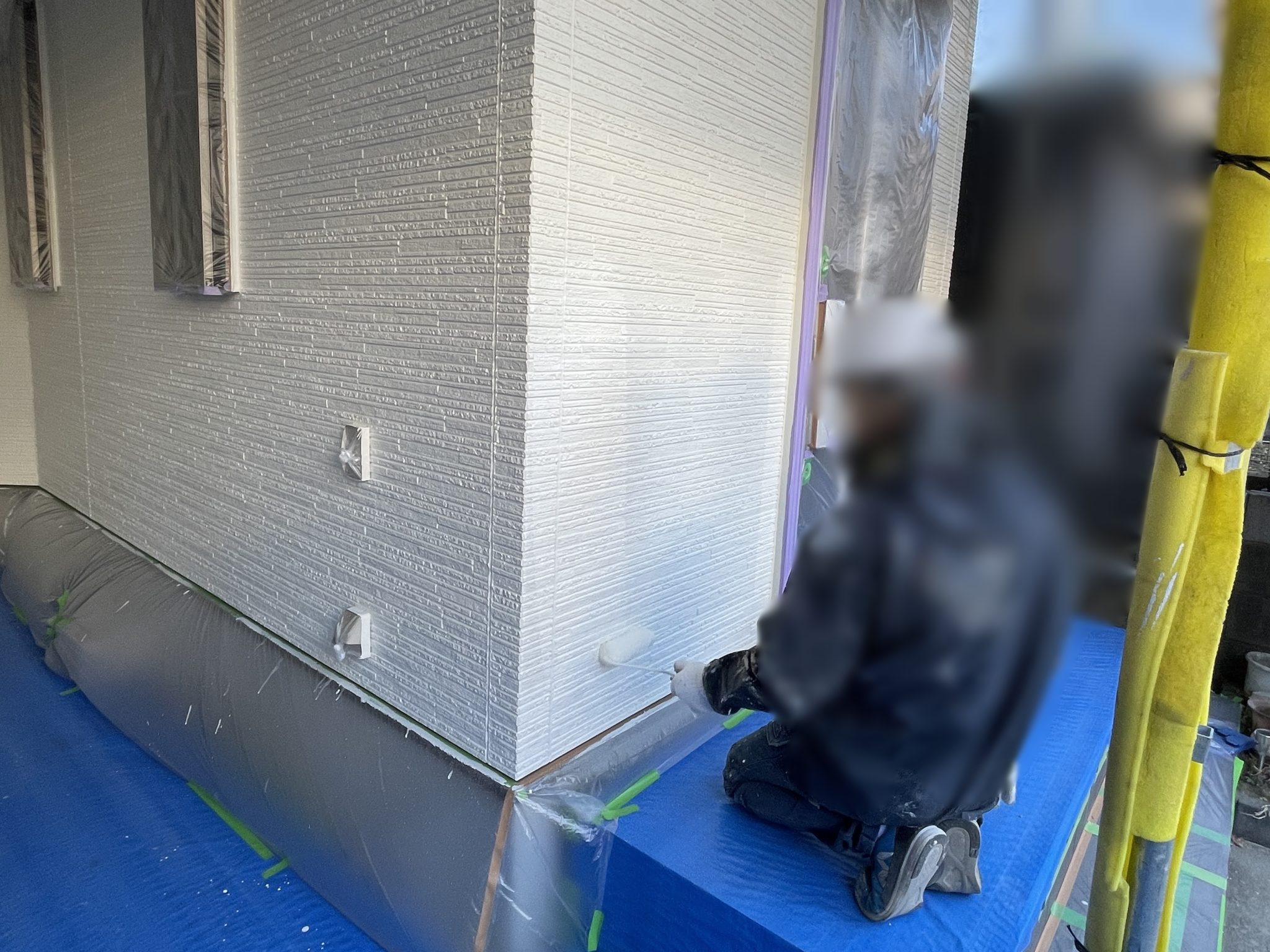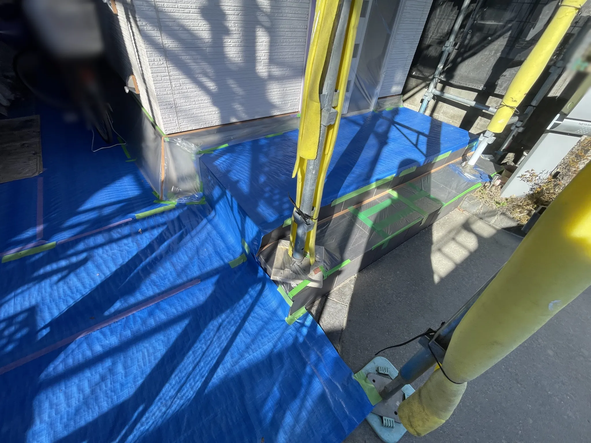 窓やコンクリート部分など、塗装しないところは全て丁寧に養生していきます。