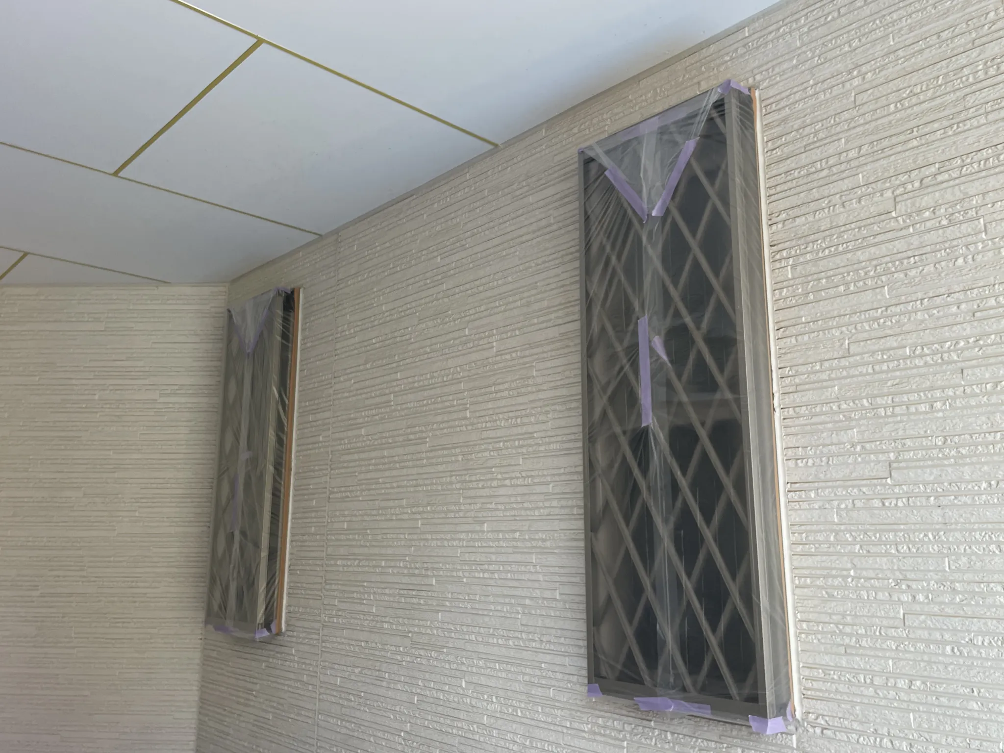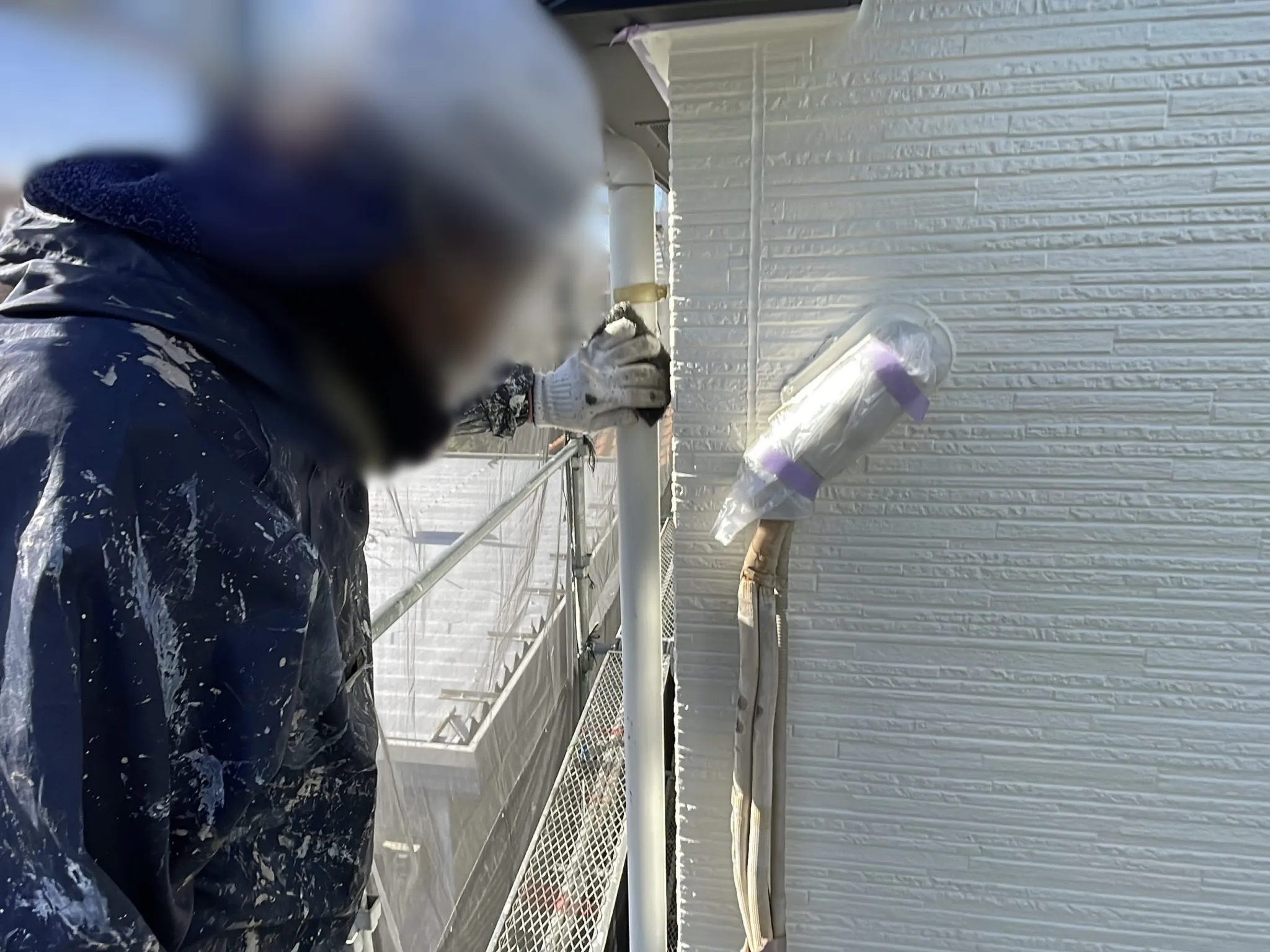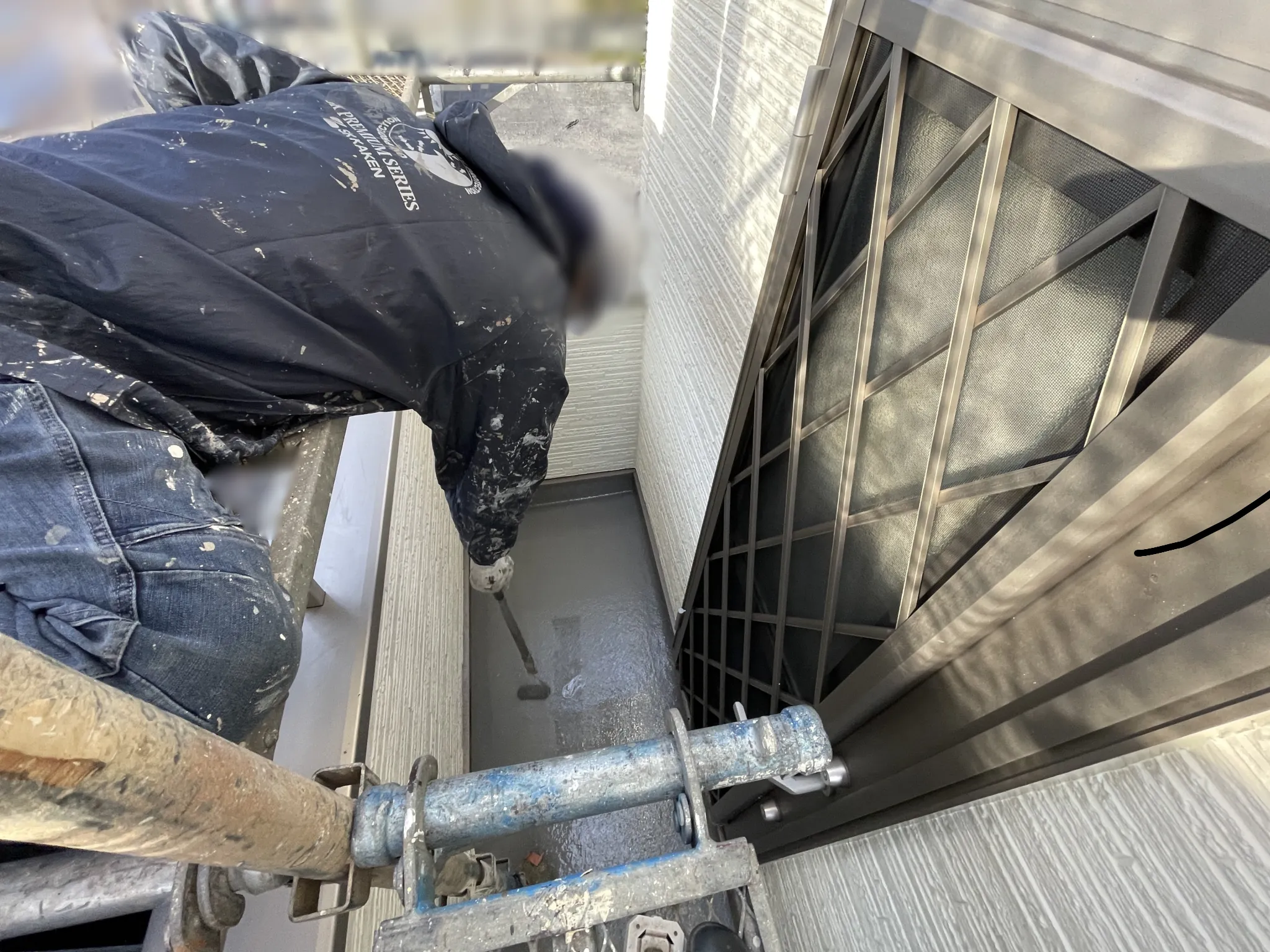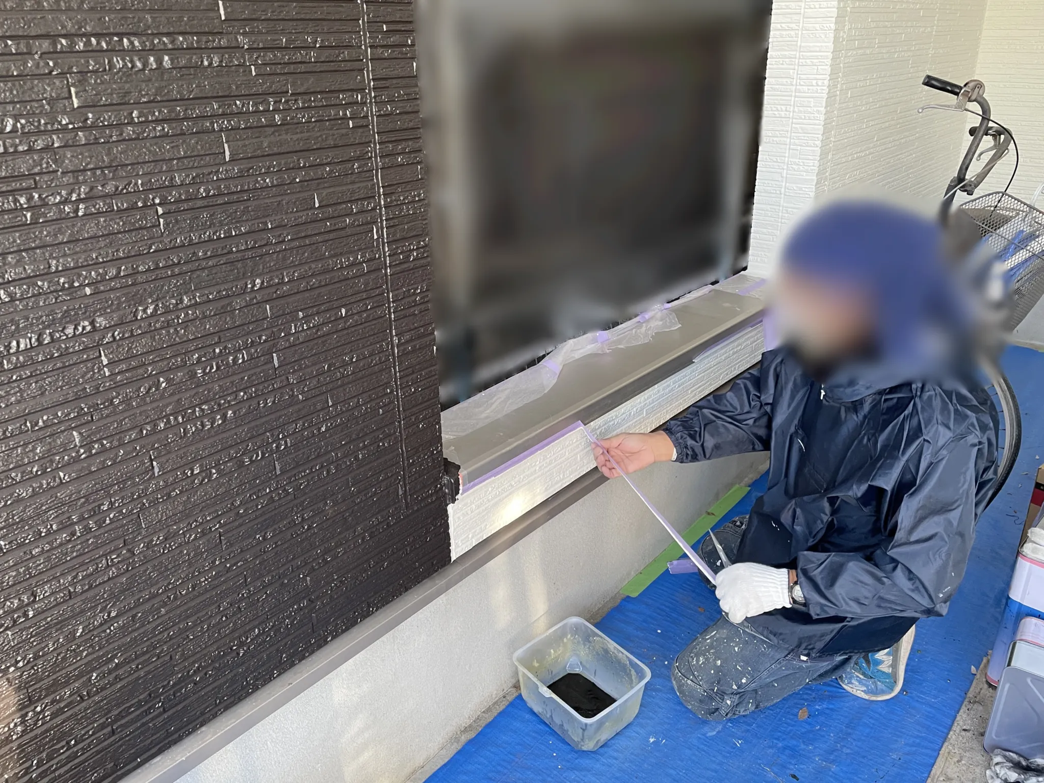 窓やコンクリート部分など、塗装しないところは全て丁寧に養生していきます。