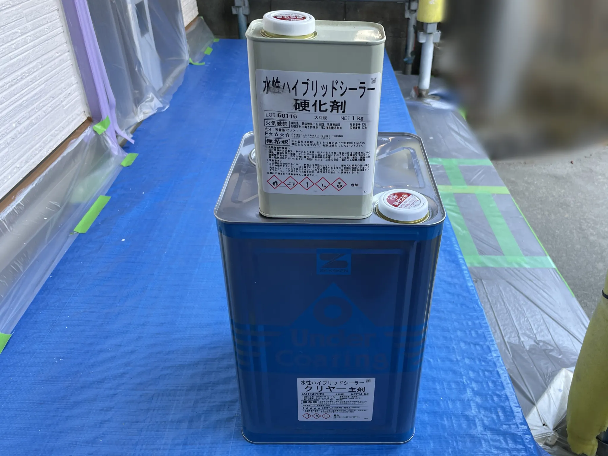 下塗材を塗ります。SK化研の水性ハイブリットシーラーは「下塗り後の乾燥時間を最低3時間以上あける(23・℃標準環境の場合)」ように指定されています。